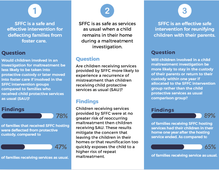 In 2013, Safe Families for Children (SFFC) initiated a Randomized Controlled Trial (RCT). The research was conducted by Dr. Mark F. Testa, Distinguished Professor Emeritus, School of Social Work, University of North Carolina at Chapel Hill. The trial concluded in 2018, affirming SFFC’s effectiveness, with 78% of families who received SFFC care being deflected from foster care, compared to the 47% of families receiving prevention services as usual. This community-driven model focuses on creating supportive relationships, not separation, and it’s working with 98% of families who engage with Safe Families remaining safely together.